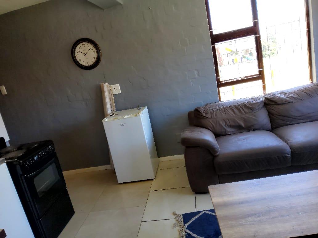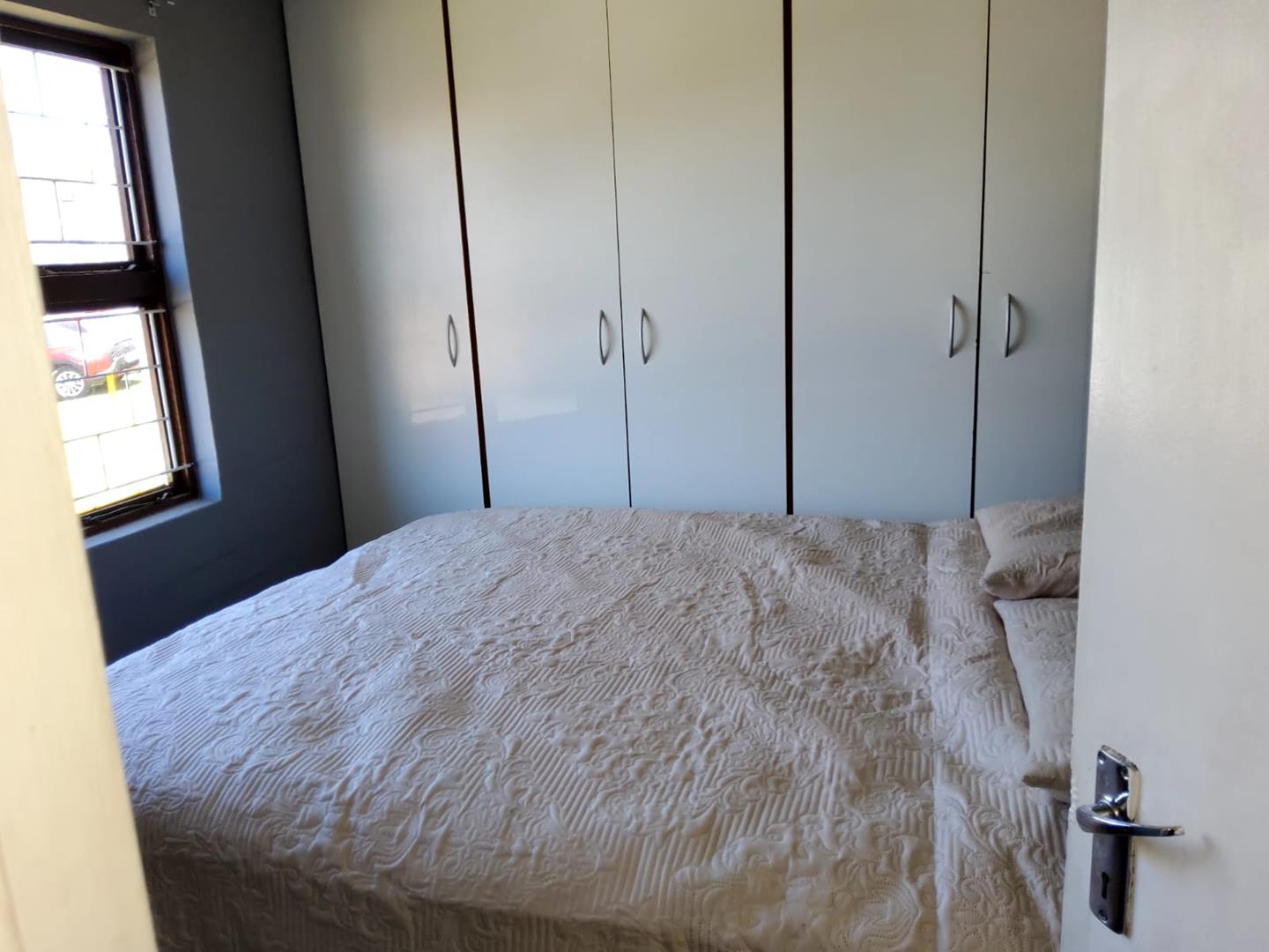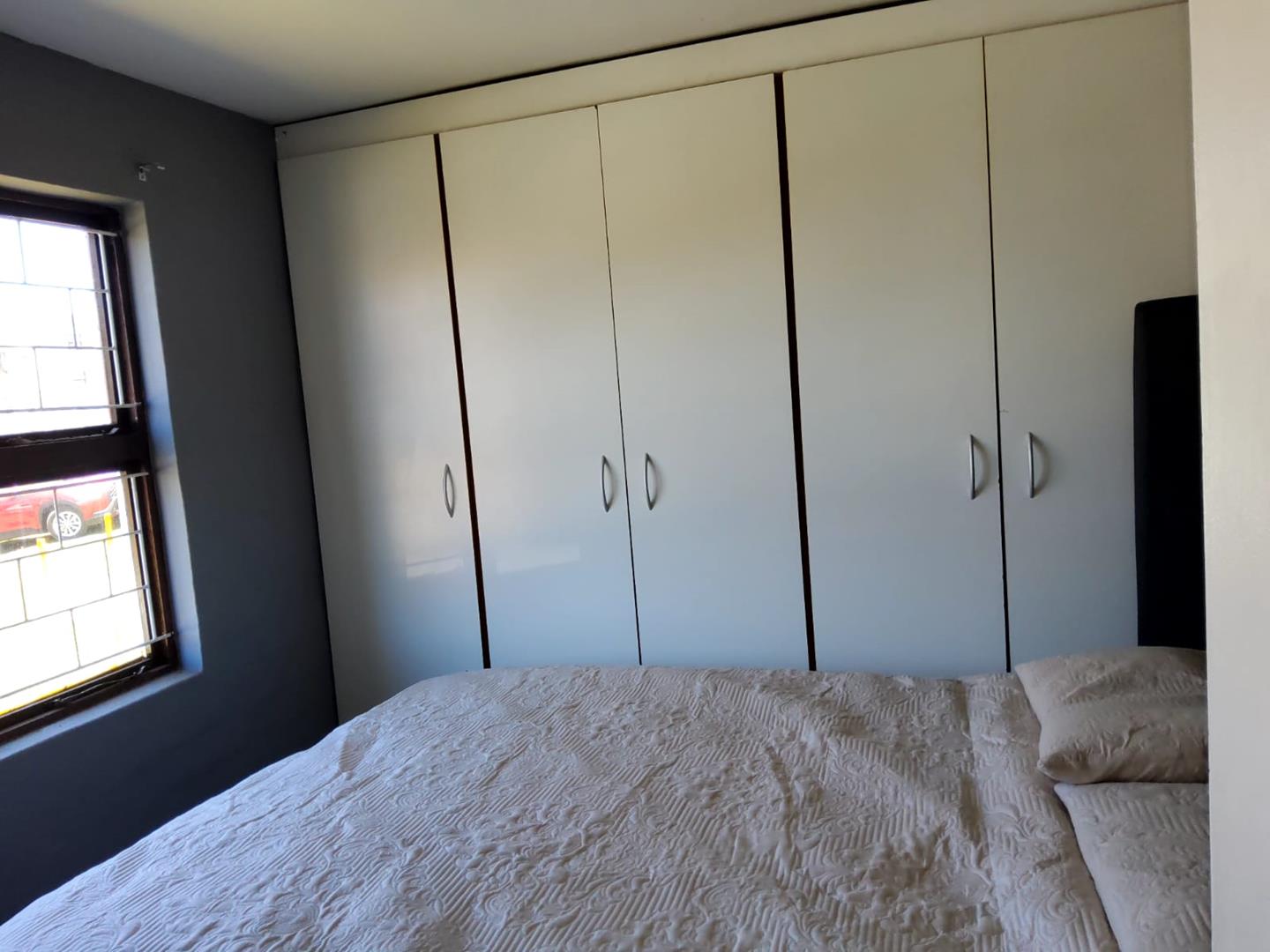 The open-plan kitchen is designed with functionality in mind, boasting built-in cupboards and sleek tiles that seamlessly flow into the lounge area. The lounge, complete with blinds and burglar bars for added safety, is perfect for relaxation and entertaining.