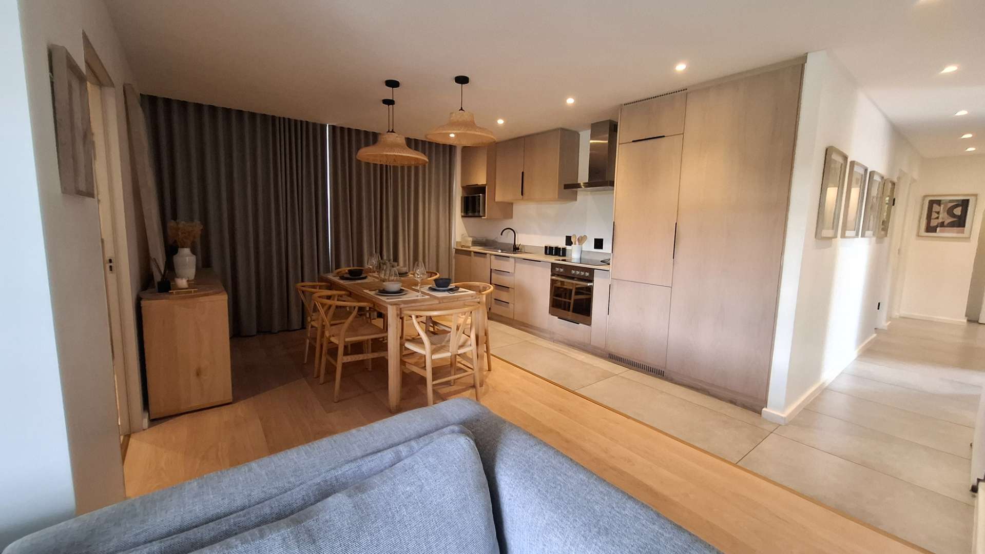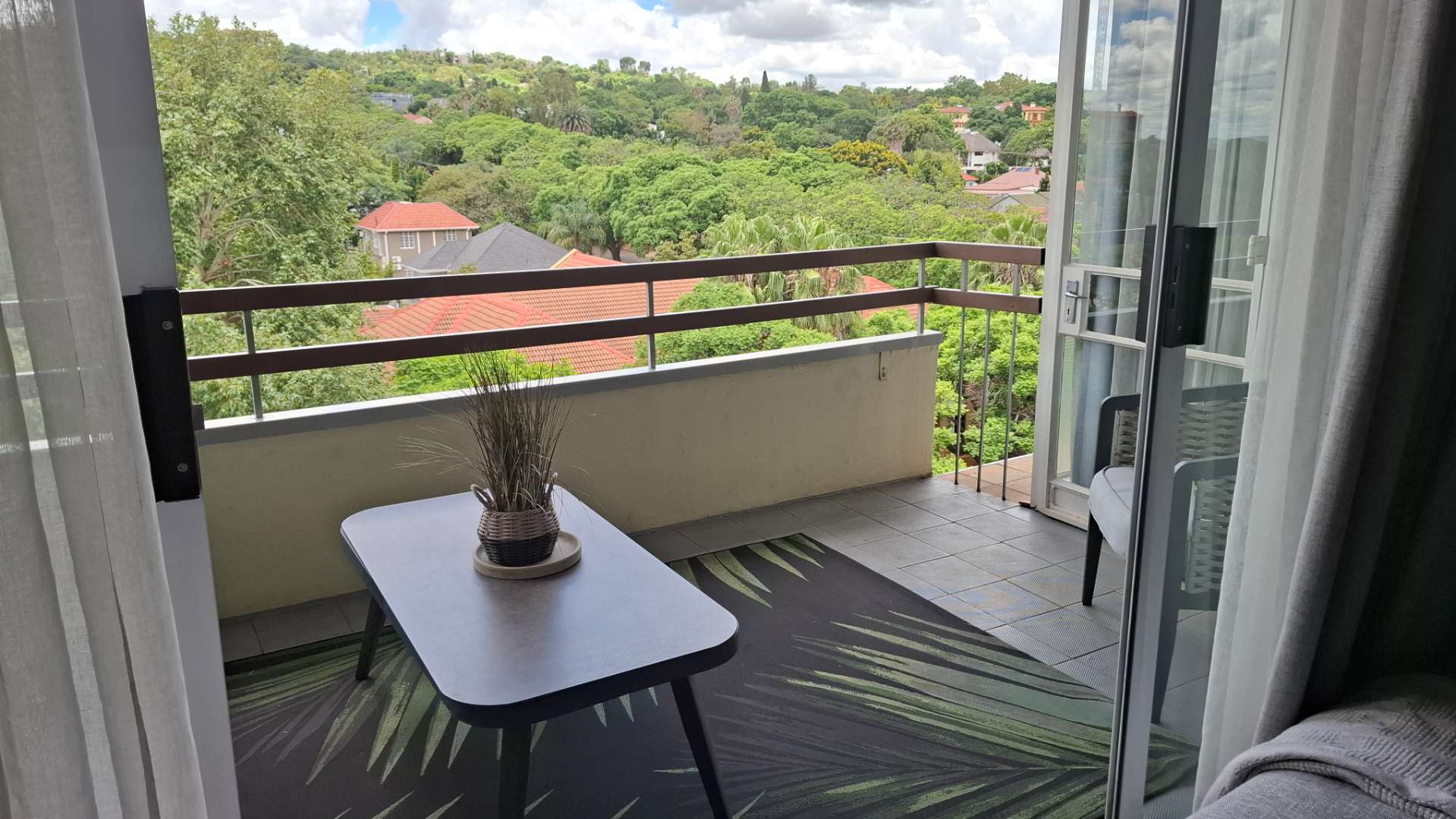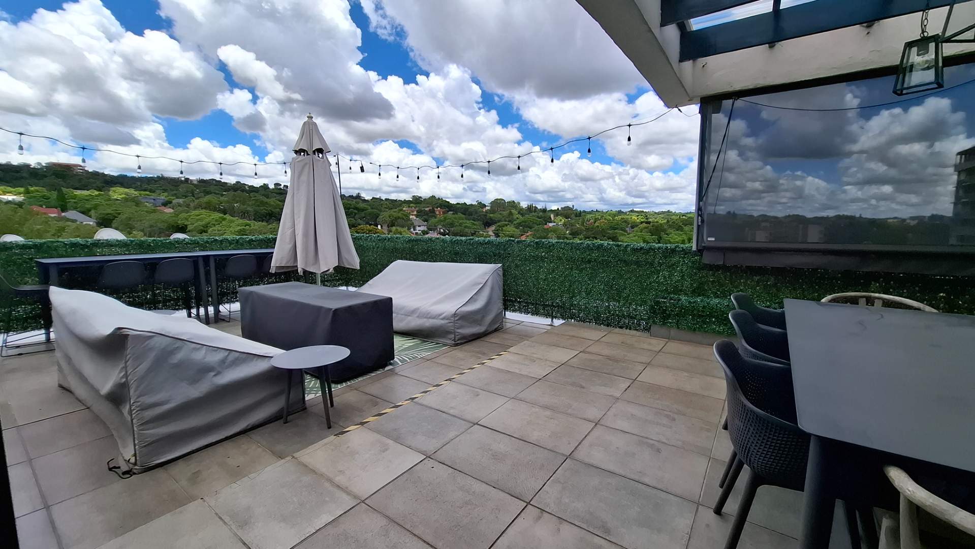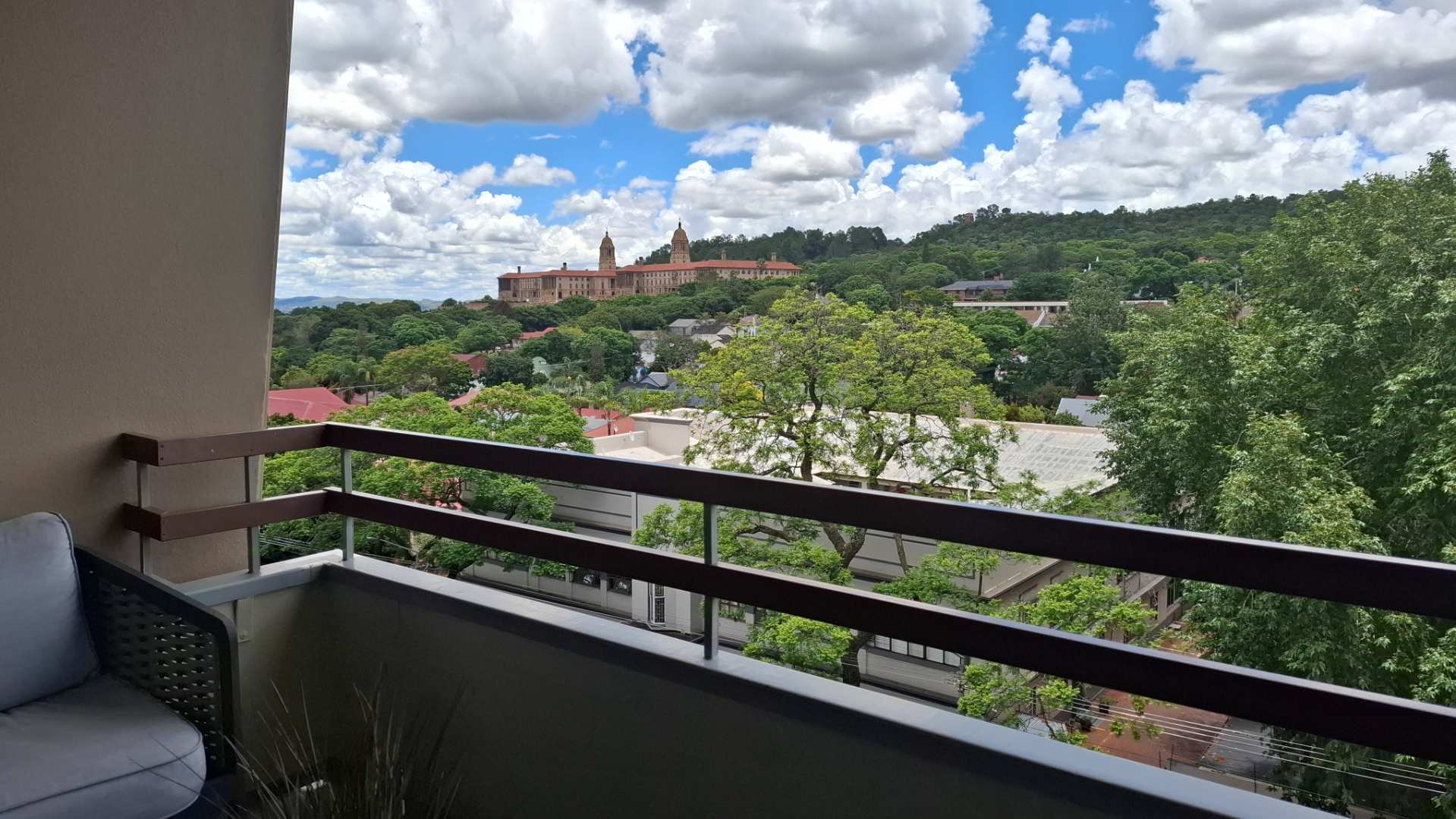 The heart of this home is its luxurious kitchen, thoughtfully designed with modern aesthetics and functionality in mind. It includes a hidden fridge, ensuring seamless lines and a clutter-free environment. Adjacent to the kitchen is an inviting lounge area, perfect for entertaining or unwinding after a long day. The lounge opens up to a spacious patio through a sliding door, where you can enjoy a breathtaking view of the iconic Union Buildings.