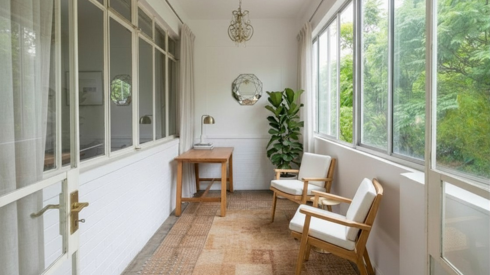 The apartment features a spacious bedroom and two bathrooms, ideal for modern living. The reception area flows onto an enclosed glass window patio, creating a bright and versatile space for relaxation or entertaining.