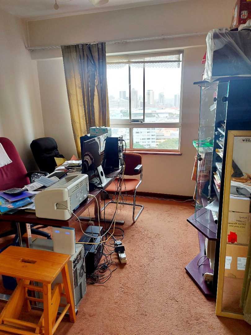 Currently utilized as an office, the fully carpeted second bedroom offers breathtaking city views. The half-bedroom, adorned with striking red tiles and large sliding windows, provides panoramic ocean views and can easily be transformed into an entertainment area, offering versatile living options.