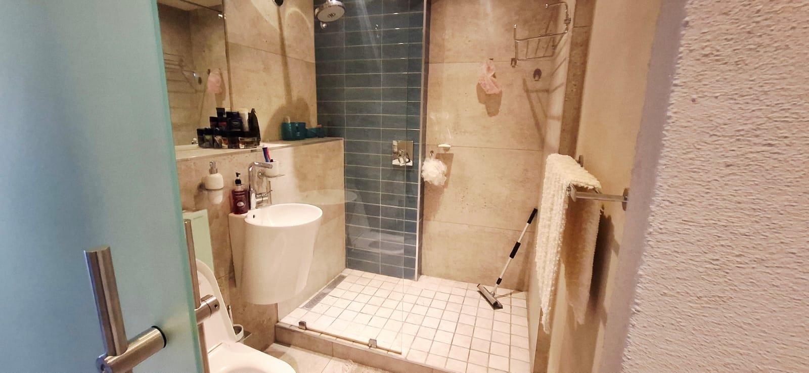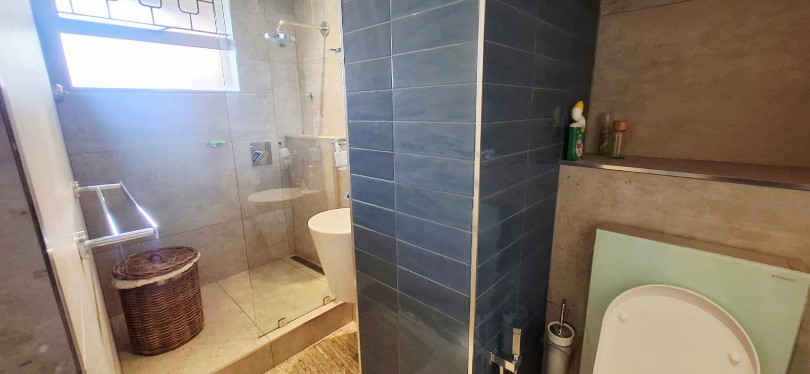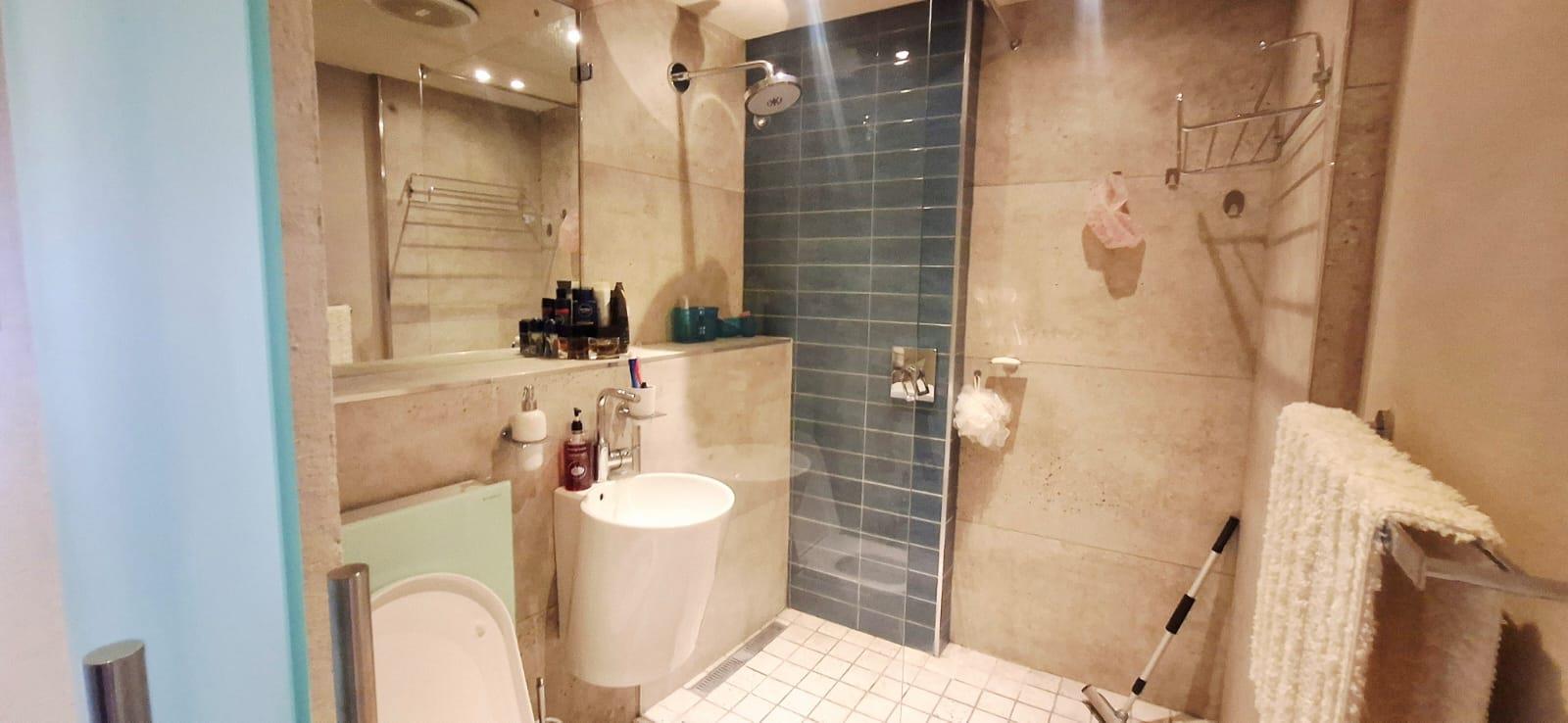 The bathroom has been immaculately designed with a precision of class which includes porcelain tiles, sliding door which leads into the shower, sandblasted glass shower, artwork of tiles intricately designed within the shower area. Verasca Oak Wooden built-inns have also been designed within the bathroom.