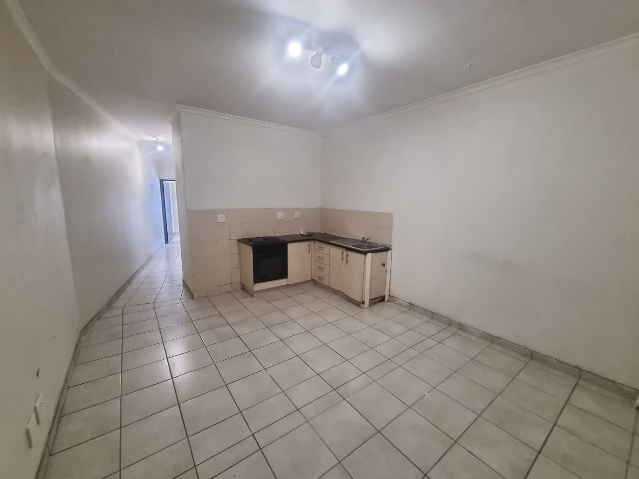 Upon entering, you are greeted by a generous open-plan kitchen, dining, and lounge area. The kitchen is thoughtfully equipped with built-in cupboards, a fitted hob, stove, and plumbing for a washing machine, offering both convenience and functionality. The living area is ideal for relaxation and entertainment.