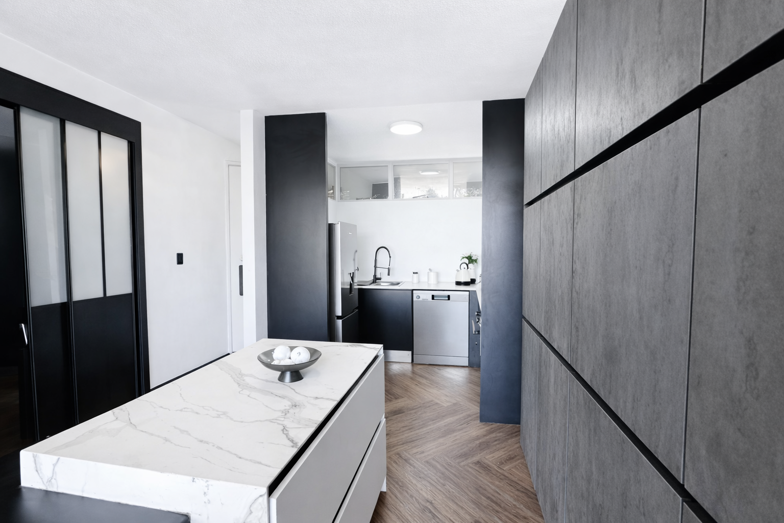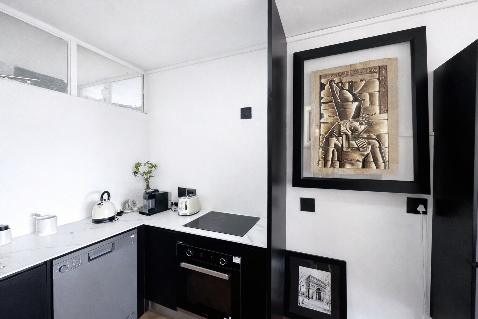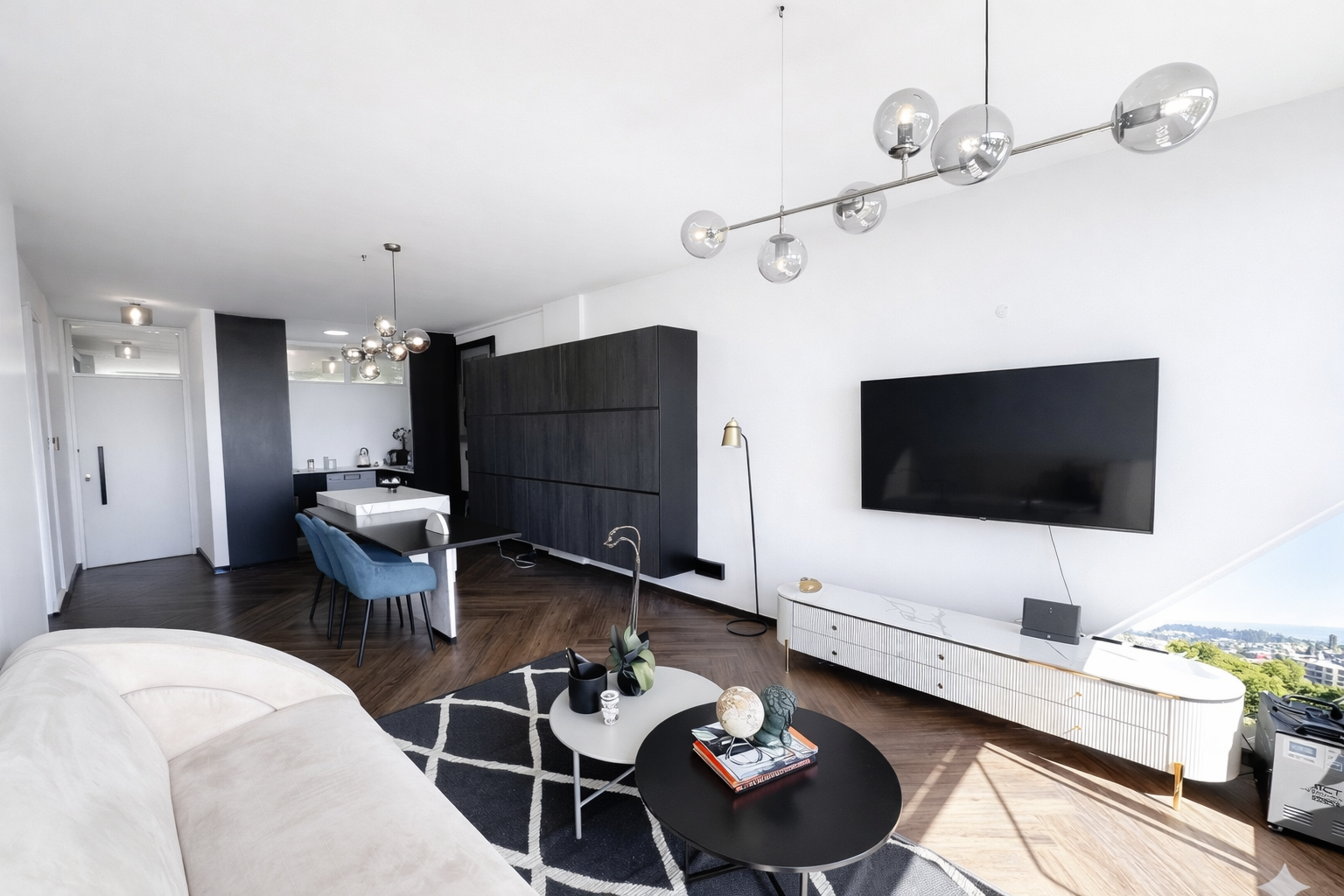 The apartment features a bright open-plan living space with quality furnishings, a modern kitchen, and a well-sized bedroom with built-in cupboards. The bathroom is neat, contemporary, and easy to maintain.