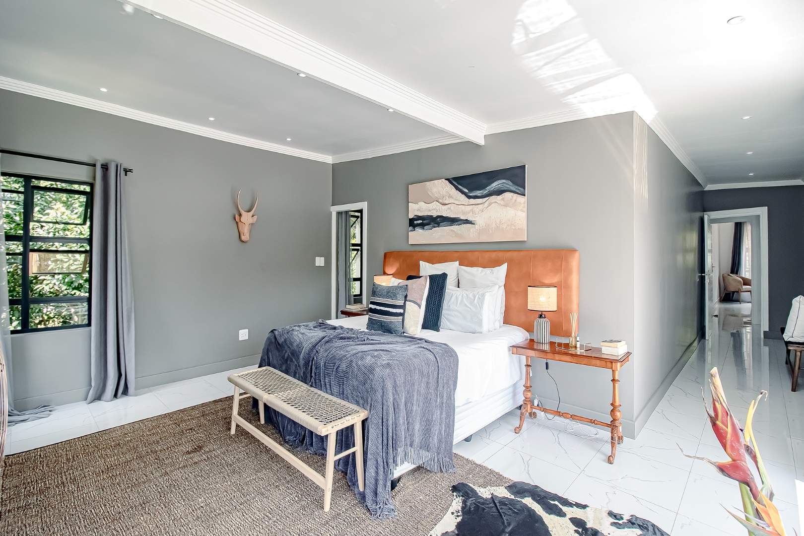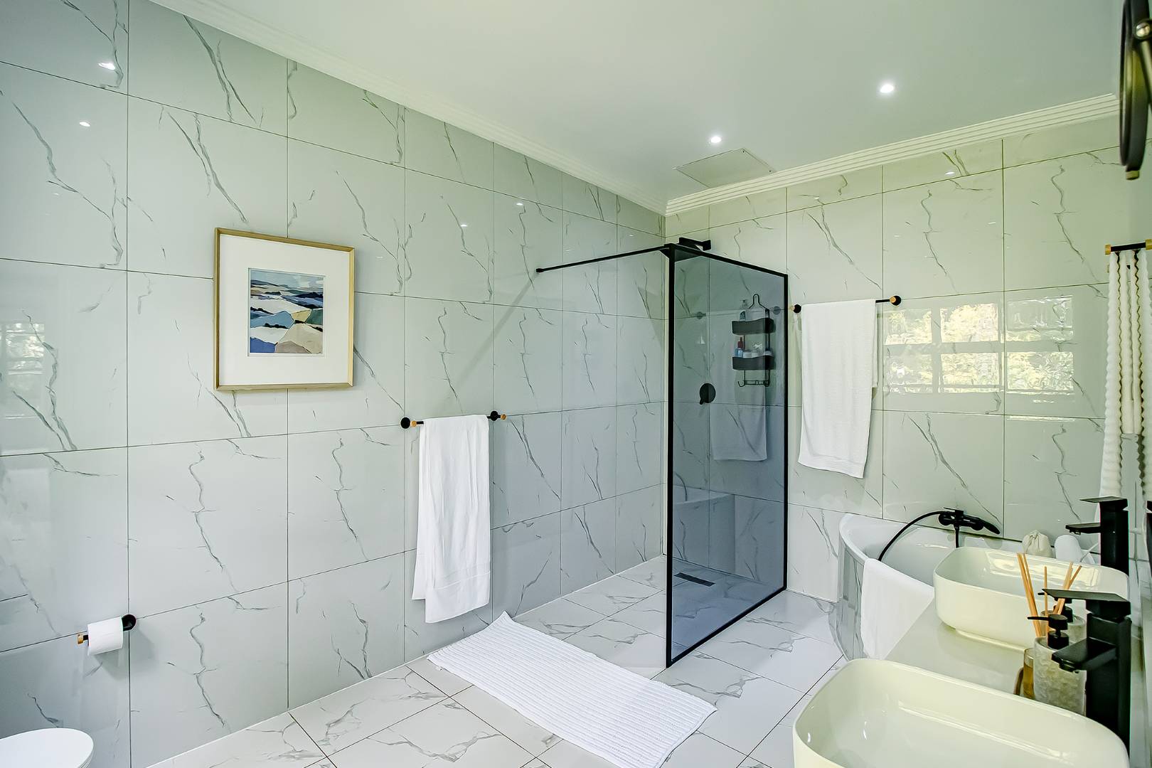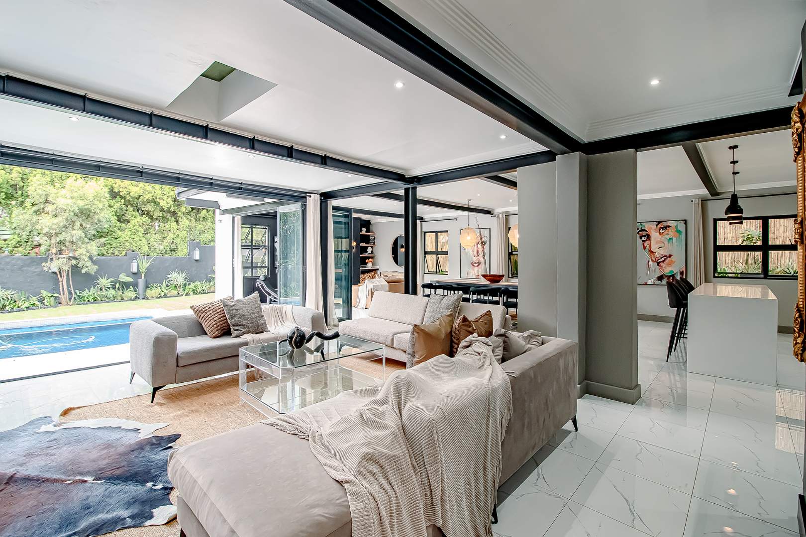 Flooded with natural light and designed for both family living and sophisticated entertaining, the home boasts expansive open-plan spaces. A sleek, modern kitchen flows into the dining area and two elegant lounges—a relaxed TV/family room and a formal lounge—complete with a stylish bar, all opening out to the landscaped garden and pool. A separate undercover patio with comfortable seating overlooks the garden, creating a beautiful, tranquil space where you feel completely immersed in the lush surroundings.