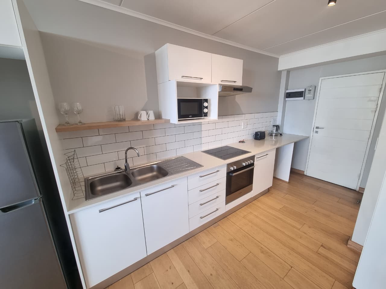 The fully-equipped kitchen comes with everything you need, including a stove, fridge, and microwave, as well as all necessary utensils, pots, pans, cutlery, and crockery. In the living area, you'll find a cozy couch and a TV cabinet with a smart TV. A small dining table and chairs provide an ideal setting for both leisure and dining. The apartment also includes a comfortable queen-size bed, complemented by bedside tables and lamps, with ample cupboard space to ensure plenty of storage for your belongings.