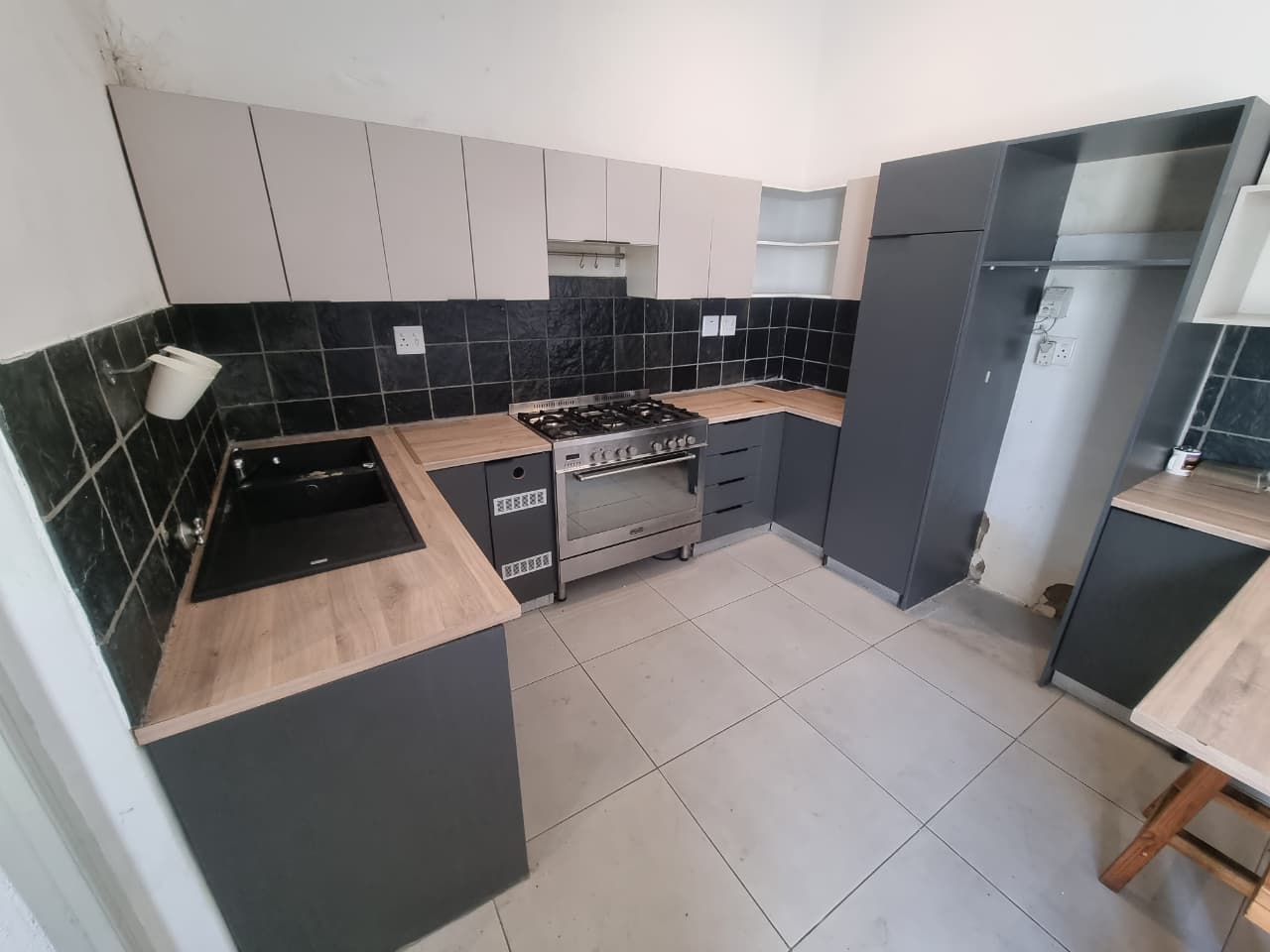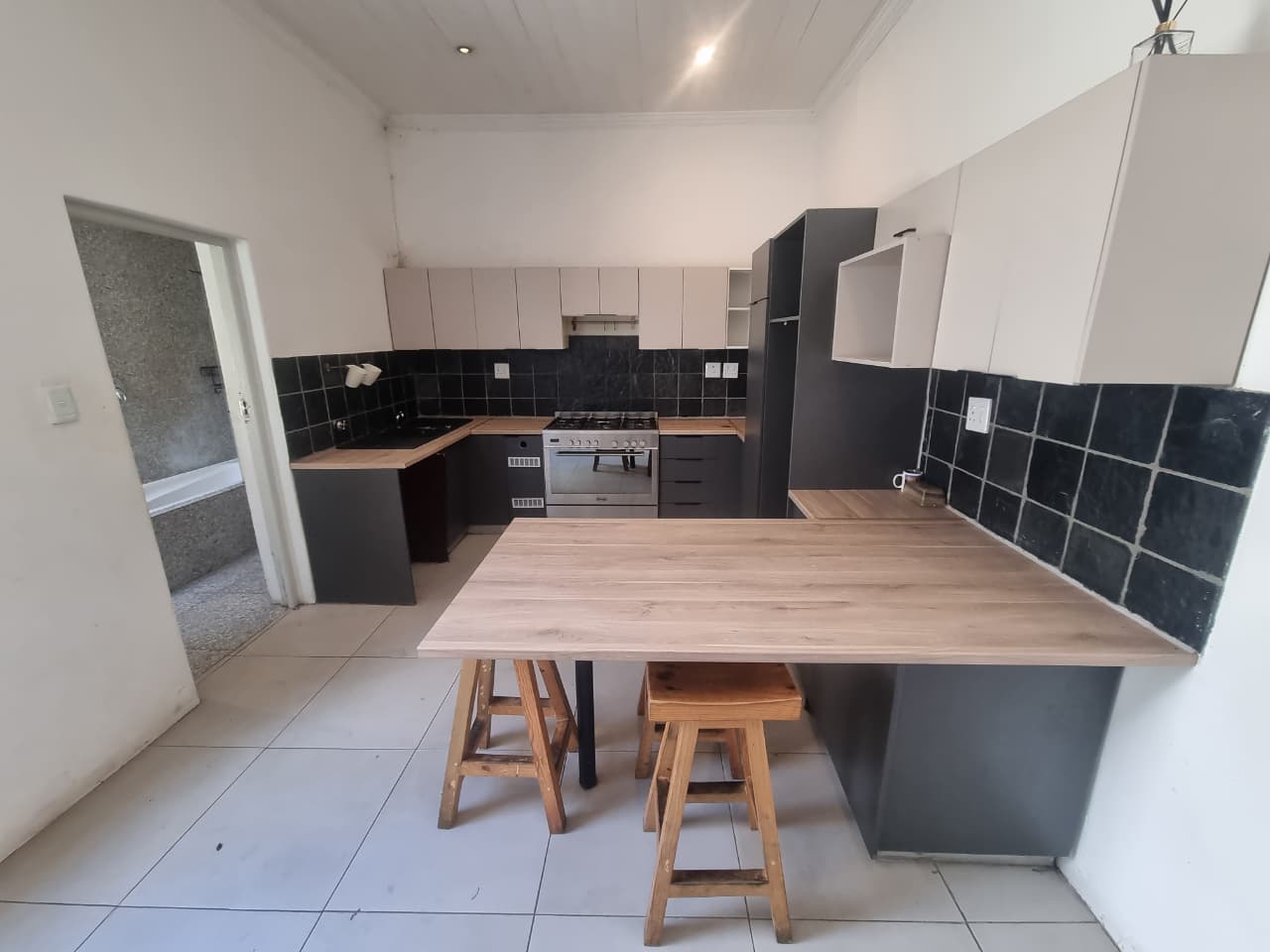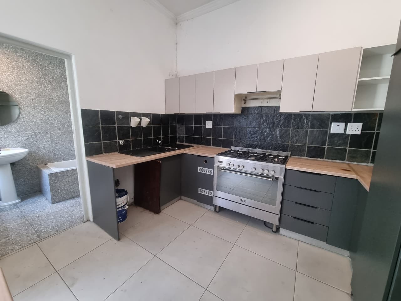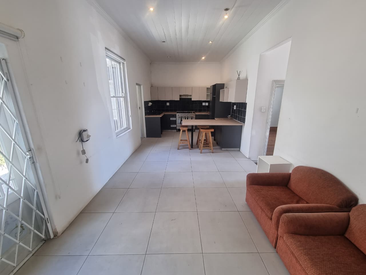 The open-plan kitchen is a highlight, boasting plenty of built-in cupboards for all your storage needs. It includes a designated area for a standard-sized refrigerator, along with a classic gas stove and an electric oven, adding a touch of elegance to your culinary experiences. The adjacent lounge area is generously sized, providing a versatile space for relaxation and entertainment. A door from the lounge leads to the backyard, a perfect setting for hosting and entertaining guests during warm, sunny days.